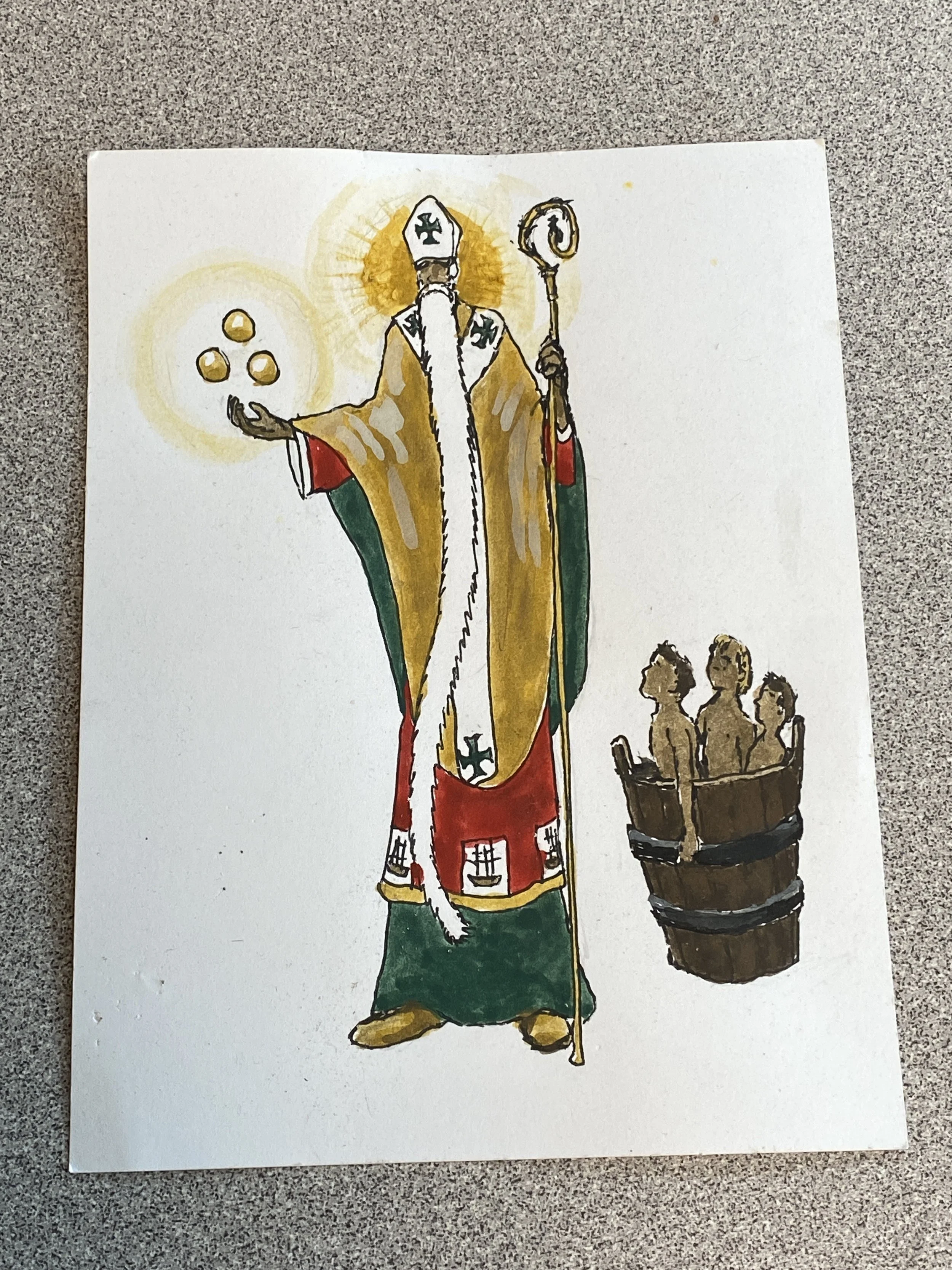 Several days later, a man named Nicholas was visiting the region to help the hungry. He was a devout man and was the acting bishop of the land. Talking to the butcher, he could see through this evil man’s lies and demanded to see inside his shop. Upon inspection, Nicholas was horrified to find the remains of the three boys in the pickling tub, the butcher preparing to sell them as pork.